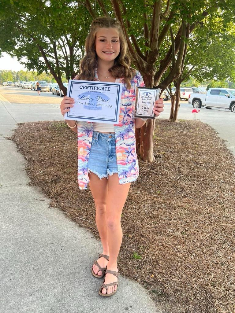 Miss Bailey Brock, daughter of Margaret Ann and granddaughter of Mrs. Sherri, received her 3 year and For the T awards for not missing any swim meets! AND during her track meet, she place 33rd in the state in the 1600/mile and 37th in the state in the 800/1.2 mile! You go, girl!