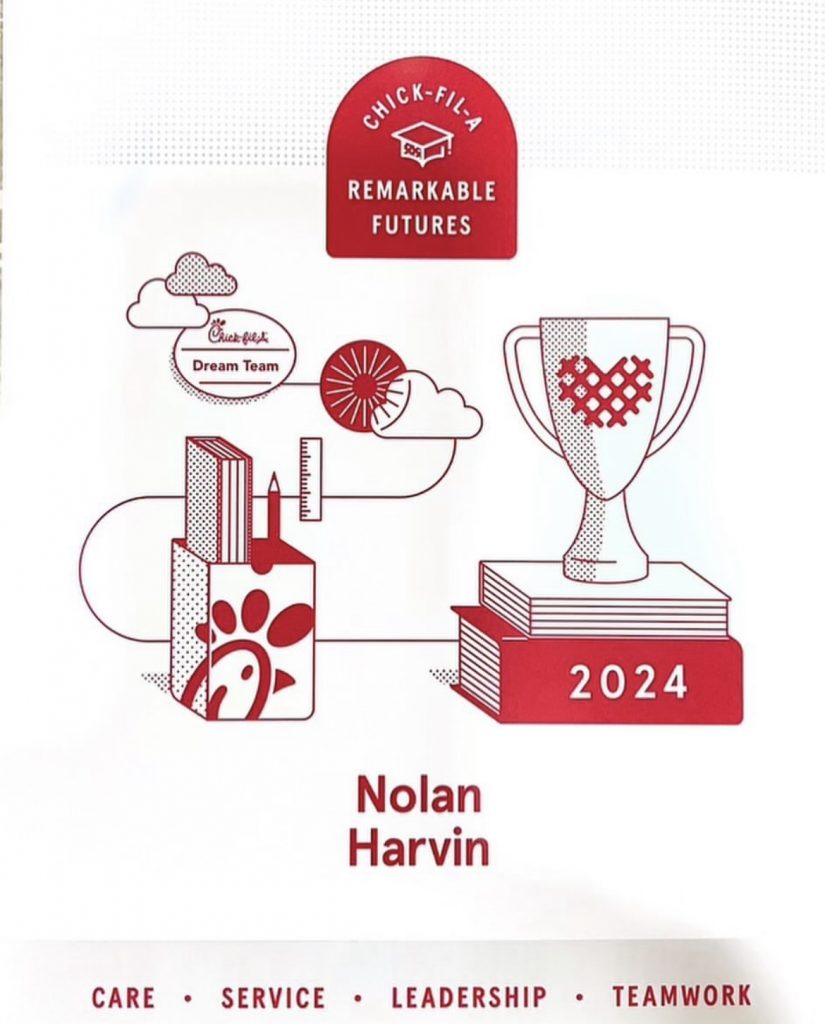 Tate Harvin, son of Jennifer Harvin, received a scholarship from Chick-fil-a! Tate was chosen as a scholarship recipient based on his performance and his grades! Way to go, Tate!