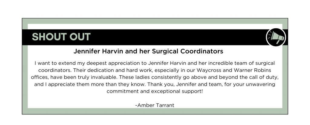 Surgery Coordinator: Niki PowellNiki is ALWAYS is going above and beyond at work. She is always putting in that extra effort and it really stands out. Niki takes on additional tasks, staying late if necessary, and always striving for excellence when it comes to our patients. She simply pays attention to the small details that others may overlook, going above and beyond shows dedication and passion for what you do Niki. Niki is always on the clock when it comes to our patients. She is always willing to make sure patients have her number for anything. She was mentioned several times in our patient surveys. She also helped train one of our team members on how to complete the MA process. She contributes to the success of the team and organization as a whole. Plus, when you consistently go the extra mile, it sets you apart from your peers. So next time you’re at work, challenge yourself to push beyond expectations – you never know where it might take you! We are truly blessed to have Niki on our Surgery Coordinator Team.