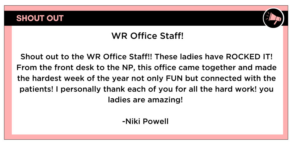 Marketing: Niki PowellNiki Powell- I’m thrilled to announce Niki Powell as our Employee of the Month. Niki consistently goes above and beyond in her duties, assisting with the front desk, serving as a Medical Assistant, and providing exceptional support to our Warner Robins office during Thanksgiving. Niki received a heartfelt review from a patient who praised her thoroughness and kindness in explaining the surgery setup process. Her dedication and willingness to exceed expectations without hesitation make her an invaluable team member. We are incredibly grateful for Niki’s hard work and commitment. Thank you, Niki, for everything you do!