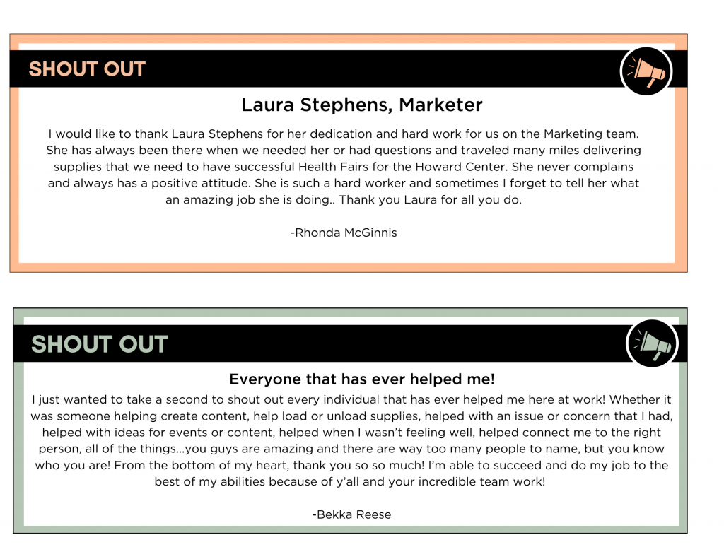 Marketing Department: Luisa “LuLu” FigueroaI want to recognize Luisa for her outstanding work on the marketing team for our Decatur office. She has done an exceptional job promoting the Howard Center in a new area, helping to establish our presence in the community. Luisa consistently goes above and beyond each day, fully committed to supporting our mission and advocating for the women we serve. Her dedication and hard work are truly appreciated.