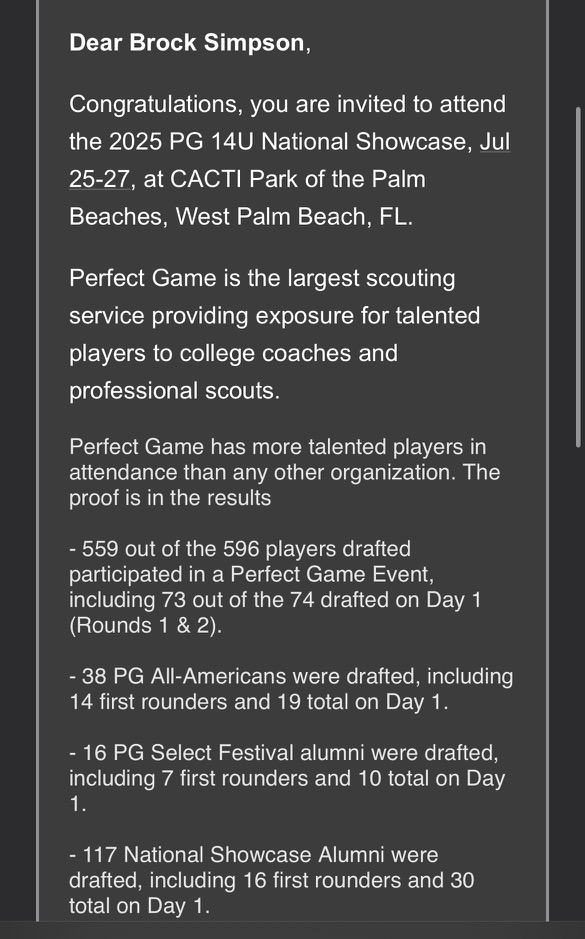 Bonnie’s grandson, Brock, is knocking this baseball season out of the park! So much so that he was invited to attend the 2025 PG 14U National Showcase in West Palm Beach in July! Way to go, Brock!