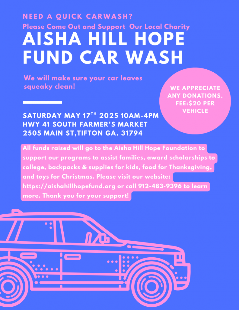 All proceeds from this car wash will go to the Aisha Hill Hope Foundation to support their programs (family assistance, back to school giveaways, scholarships, etc)