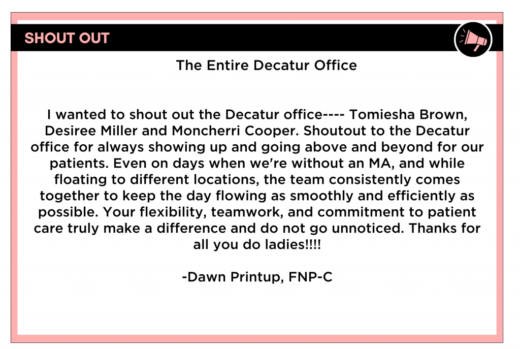 Destiny has been an absolute rockstar, stepping up to cover our Warner Robins location whenever needed without hesitation. The feedback from Managers and Nurse Practitioners has been unanimous—Destiny is a force to be reckoned with. Her efficiency and work ethic on the floor are unmatched. We are beyond proud of how far she has come since becoming a Medical Assistant. Her constant hunger to learn more and refine her skills makes her one of our top MAs. It’s not just the staff who notices her hard work; patients constantly share how sweet and full of joy she is. She brings a level of comfort and positivity to the clinic that is truly special.