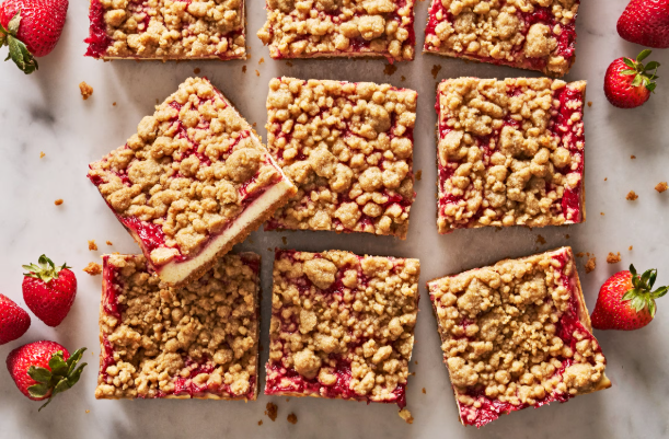 Step 1 In a medium bowl, whisk flour, brown sugar, cinnamon, and salt. Add butter and stir until a crumbly dough forms. Spread cream cheese filling over crust. Carefully dollop strawberry topping over cream cheese filling. Using your hands, crumble topping over.