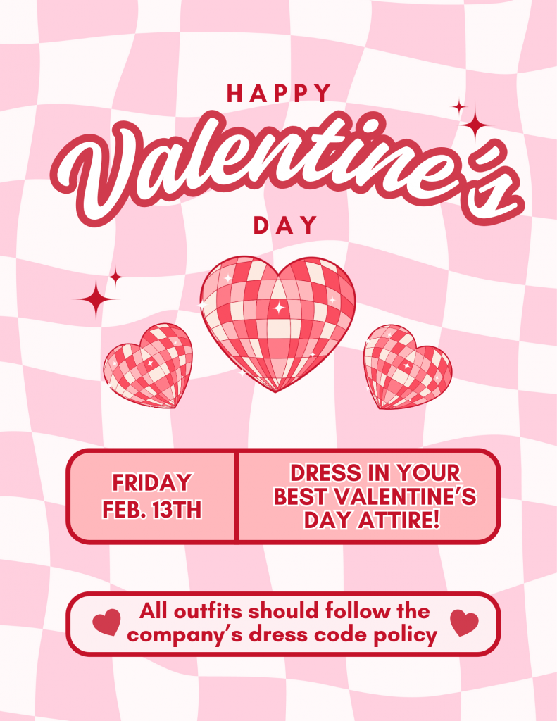 This Friday, February 13th, you’re welcome to dress in your best Valentine’s Day–themed attire! Think reds, pinks, hearts—whatever feels festive and fun!