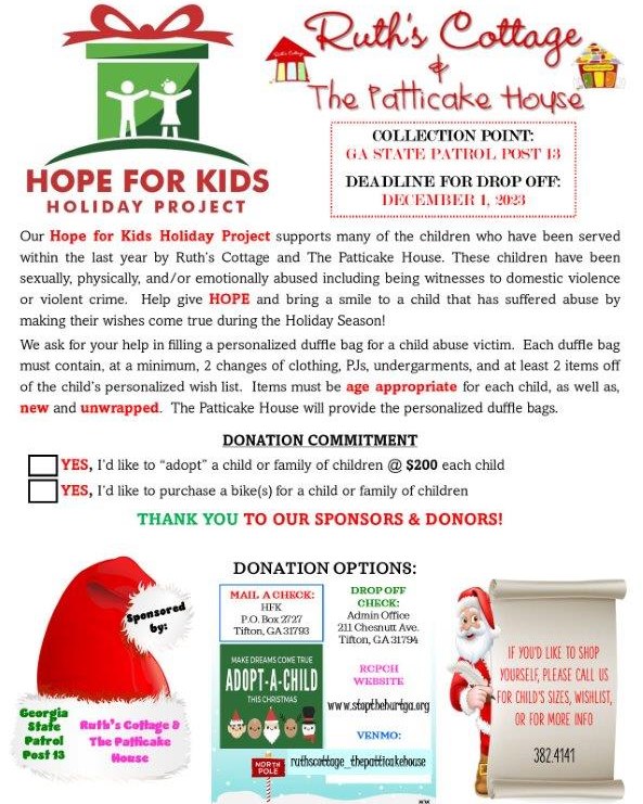Ruth’s Cottage & The Patticake House is hosting it’s annual Hope for Kids Holiday Project!