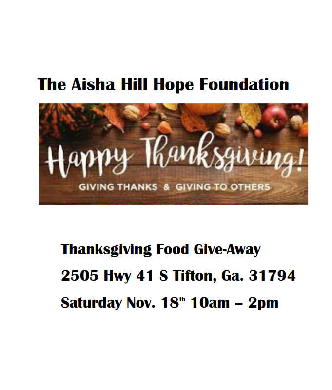Ms. Debbie Hill and her family are hosting a Thanksgiving food give-away on Saturday, November 18th from 10am-2pm.