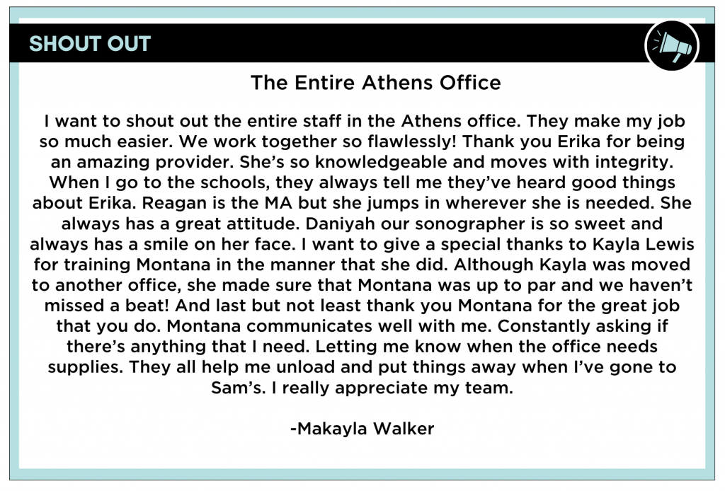 Ultrasound : Rachel FlemingThis past month, Rachel has truly been the heart of our Lawrenceville office. In addition to her role as an ultrasound tech, she stepped in to cover the MA position while the office has been without a MA. Rachel also kept up with FMLA responsibilities for all of the Northern offices during this time. Her willingness to take on multiple roles, adapt quickly, and support both patients and staff demonstrates an exceptional level of dedication and teamwork. Rachel’s hard work and reliability have made a significant impact, and we are incredibly grateful for everything she does.