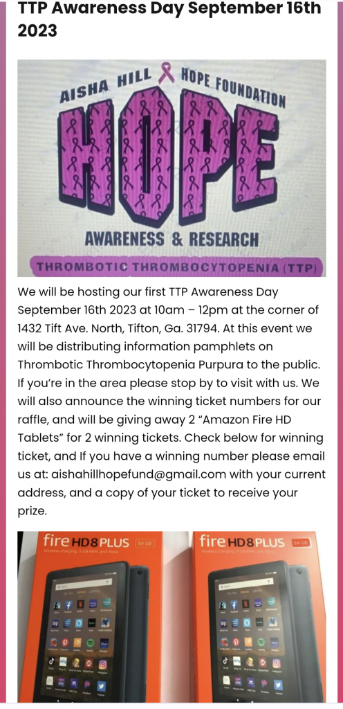 International Thrombotic Thrombocytopenic Purpura (TTP) Awareness Day is Sunday, September 17th. Some of you may remember us sharing with you all that our very own Debbie Hill, Mammogram Specialist, her niece, Aisha Hill, passed away in 2020 due to TTP and her family created The Aisha Hill Hope Foundation in her honor.