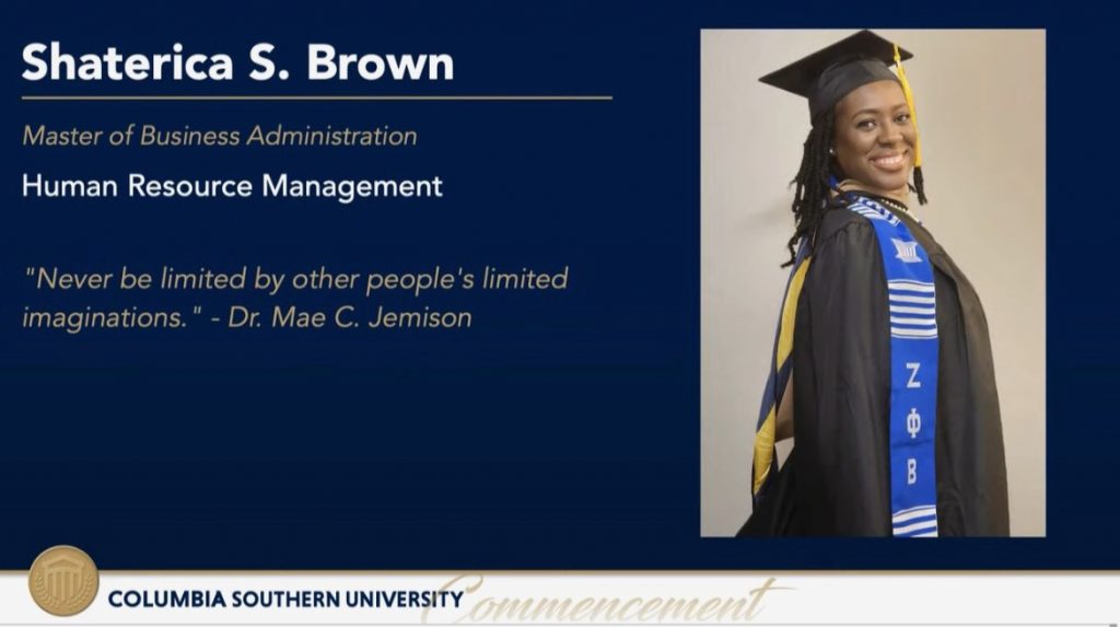 Shaterica Brown graduated from Columbia Southern University on June 9th, 2023 with a solid 4.0 GPA! Shaterica has earned a Master of Business Administration in Human Resource Management and she is currently, studying for her SHRM certification!  Congratulations, Shaterica!! We’re SO proud of you!